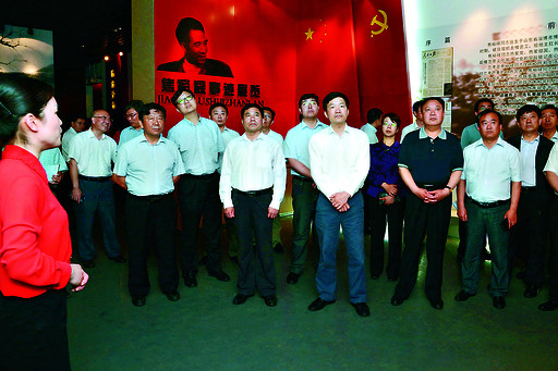 5月24日,在蘭考縣焦裕祿同志紀(jì)念館內(nèi),市委書(shū)記魏小東(前排右三)、市長(zhǎng)范修芳(前排右四)等認(rèn)真聆聽(tīng)講解員的講解。